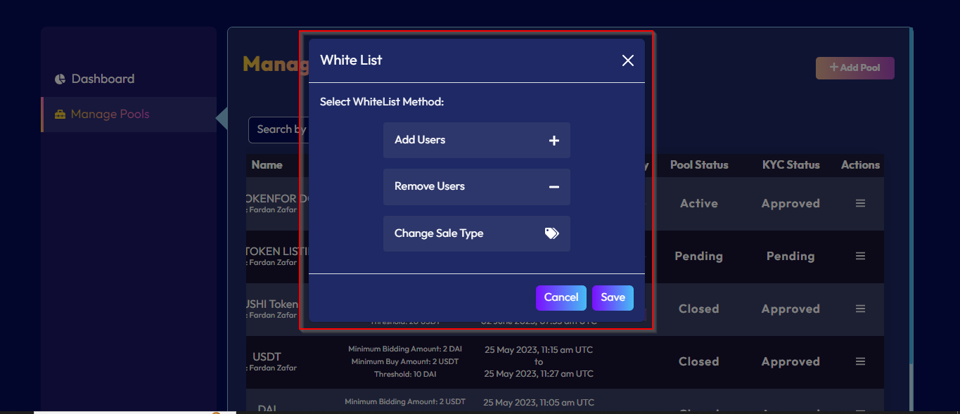 Once the IDO is created, owners can update the sale type options from whitelist to public and public to whitelist. Owners can also add whitelist addresses, remove whitelist addresses and change sale type as mentioned in the picture below.