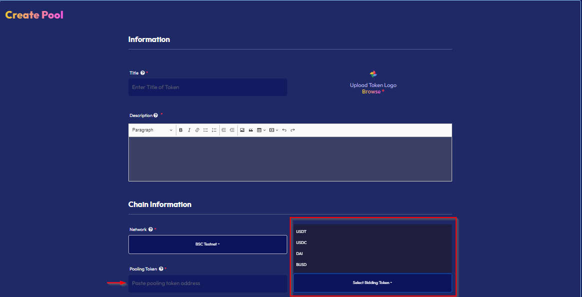 - Select “Network”, “Pooling Token” and then add your “Bidding Token” address.